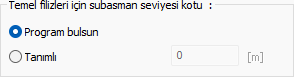 Temel filizleri için subasman seviyesi kotu ![]() Temel filizleri için subasman seviyesi kotu otomatik bulunur. Bazı özel hallerde tanımlı seçeneği kullanılarak kutucuğa istenilen subasman seviyesi kotu manuel girilebilir. |