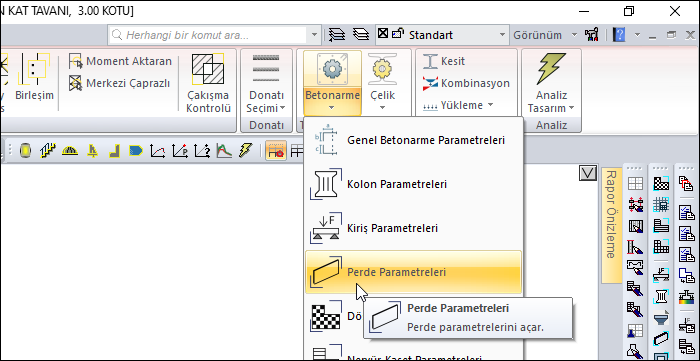 Ribbon menü Analiz ve Tasarım sekmesi Tasarım Parametreleri başlığı altından Perde Parametreleri komutuna tıklayarak Perde Parametreleri diyaloğuna ulaşabilirsiniz.