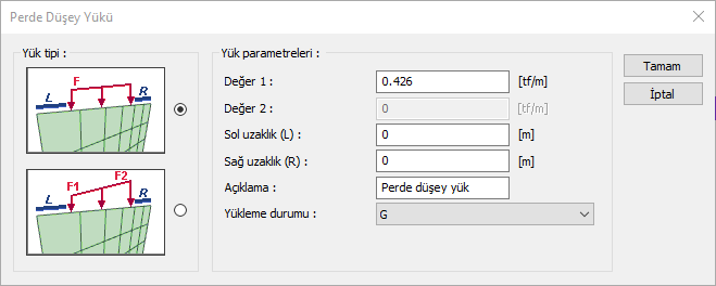 - Perde Düşey Yükü diyaloğu açılacaktır.