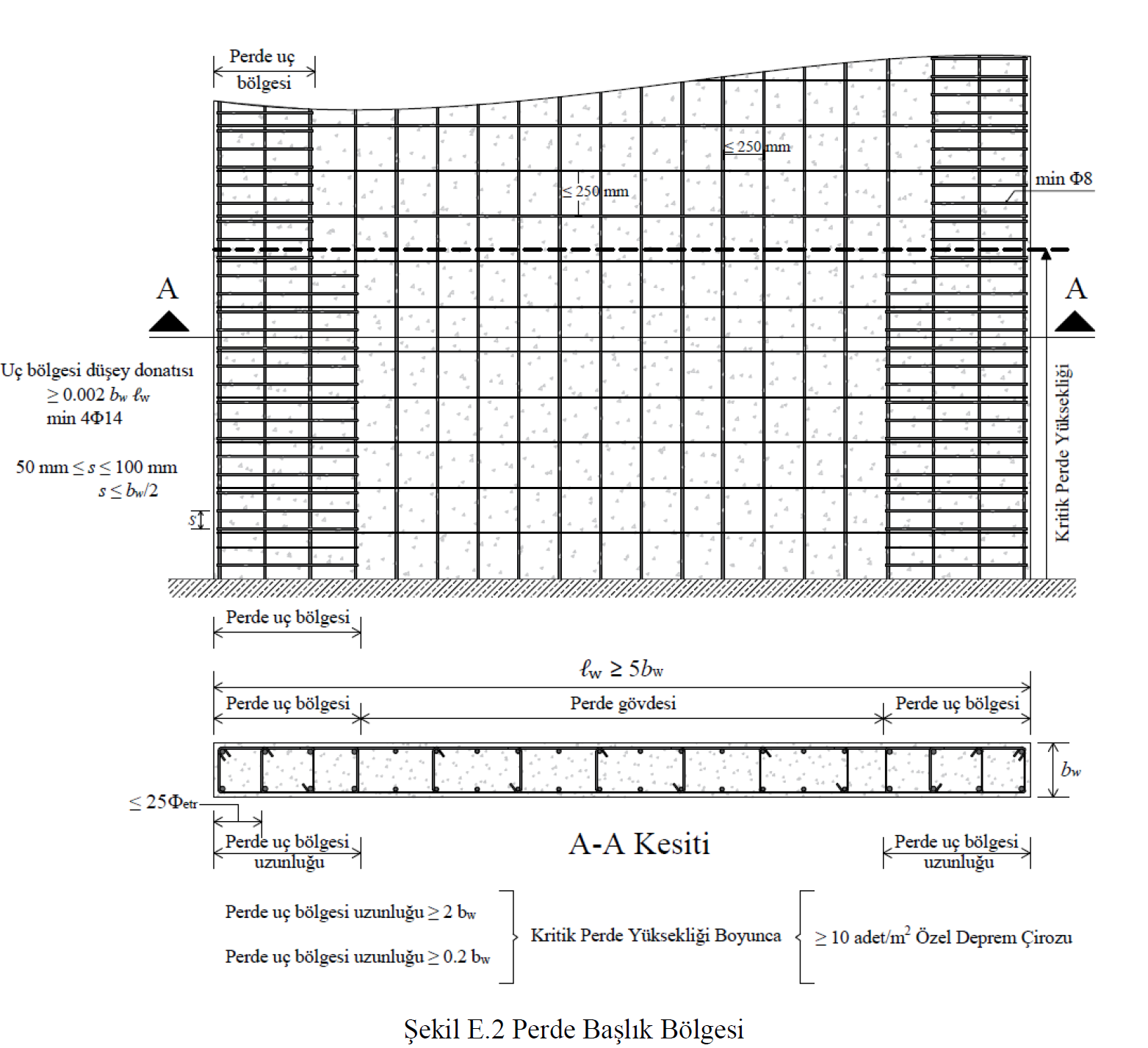 Perde başlık bölgelerinin her birinde, düşey donatı toplam alanının perde brüt enkesit alanına oranı 0.002 ’den az olmayacaktır. Perde başlık bölgelerinin her birinde düşey donatı miktarı 4Φ14 ’ten az olmayacaktır (Şekil E.2).