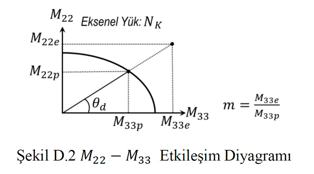 Düşey yükler ve deprem etkileri altında (G+nQ±E) iki eksenli perde taban kesit momenti (M22e , M33e) ve taban kesme kuvveti (V22e, V33e) hesaplanır. Daha sonra düşey yükler ve azaltılmış deprem etkileri altında (G+nQ±E/6) elde edilen NK değeri için M22 - M33 etkileşim diyagramı oluşturulur. Bu diyagram üzerinde perde taban plastik moment kapasitesi (M22p, M33p), iki eksenli kesit moment değerlerinin oranı ile uyumlu olarak Şekil D.2 ’de gösterildiği gibi hesaplanır. Perde tabanına etki eden deprem kesme kuvveti (V22e, V33e) hesaplanan m değerine bölünerek ve Denklem E.1 ile Ve /Vr değeri hesaplanacaktır.