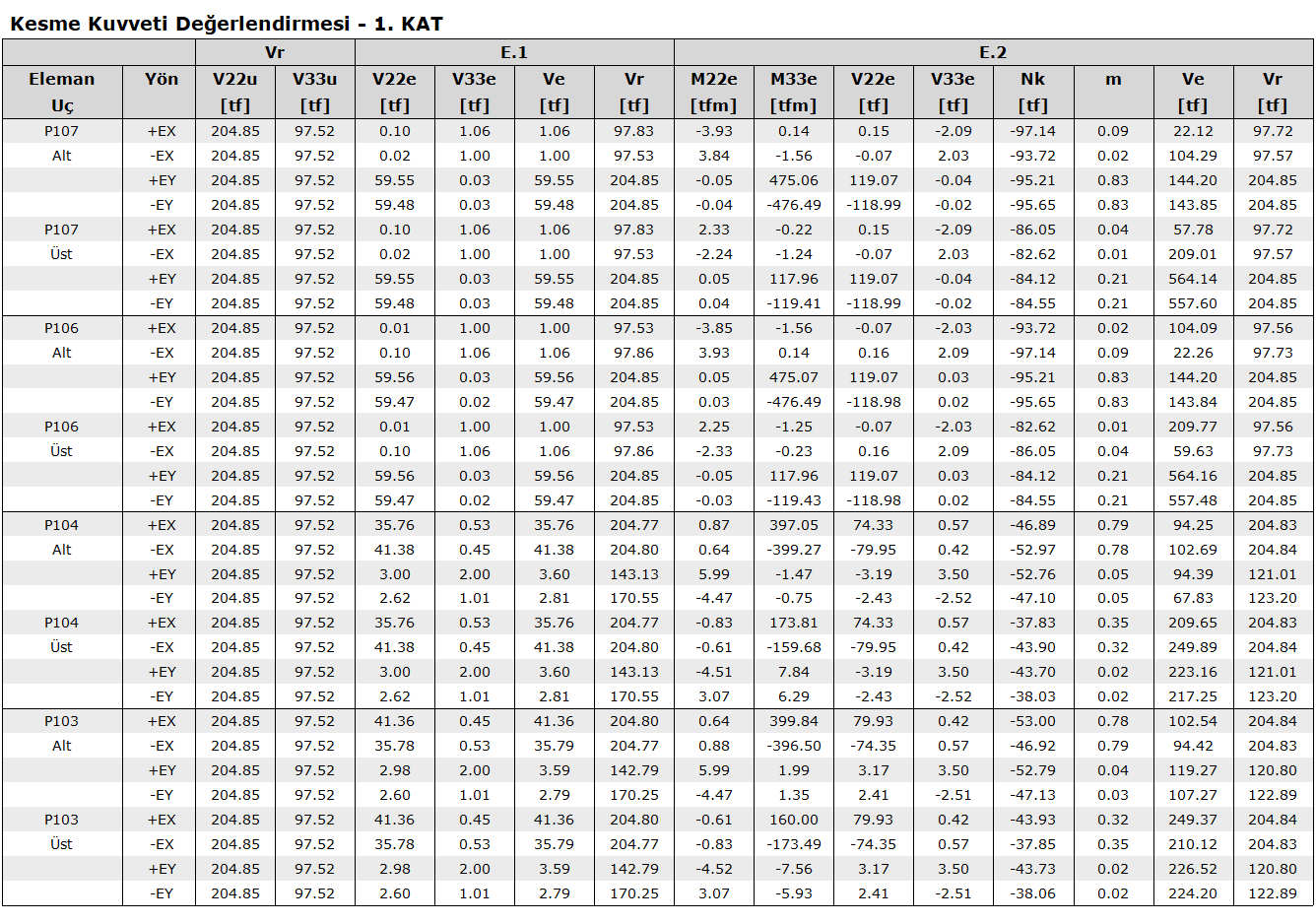 Aşağıdaki resimlerde E.1 başlığı altında gösterilen tabloda 1. Durum için hesaplanan Ve ve Vr değerleri görülmektedir. E.2 başlığı altında gösterilen tabloda 2 Durum için hesaplanan Ve ve Vr değerleri ile birlikte M22e ve M33e, değerleri, Etki/Kapasite oranı m değeri gösterilmektedir. Ve /Vr verilen iki durumun en küçüğü olarak alınır.