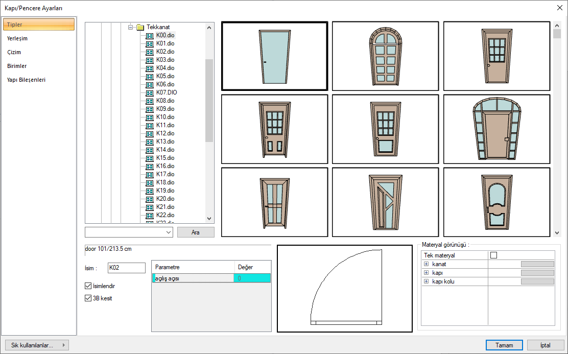Kapı/pencere ayarları diyaloğu açılacaktır. Tipler sekmesinden boşluk şekline uygun bir kapı/pencere seçin.