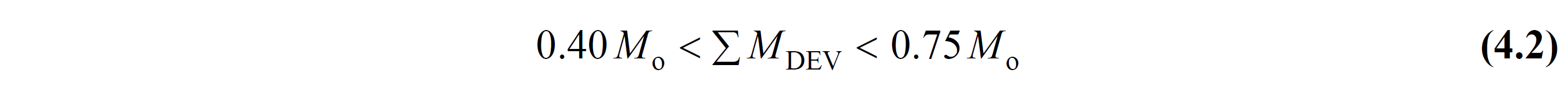 Süneklik düzeyi yüksek bağ kirişli (boşluklu) veya boşluksuz yerinde dökme betonarme perdeler ile moment aktaran süneklik düzeyi yüksek çerçevelerin birlikte kullanıldığı binalarda, perdelerin tabanında deprem yüklerinden meydana gelen devrilme momentlerinin toplamı, MDEV , binanın tümü için deprem yüklerinden tabanda meydana gelen toplam devrilme momentinin, Mo %40’ından az, %75’inden fazla olmayacaktır. Denklem 4.2 ’de bu bağıntı gösterilmiştir.