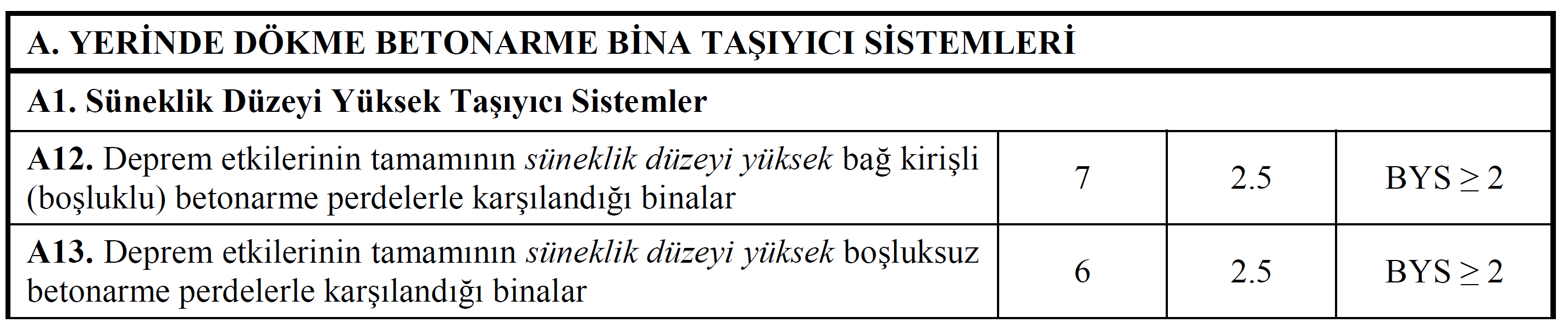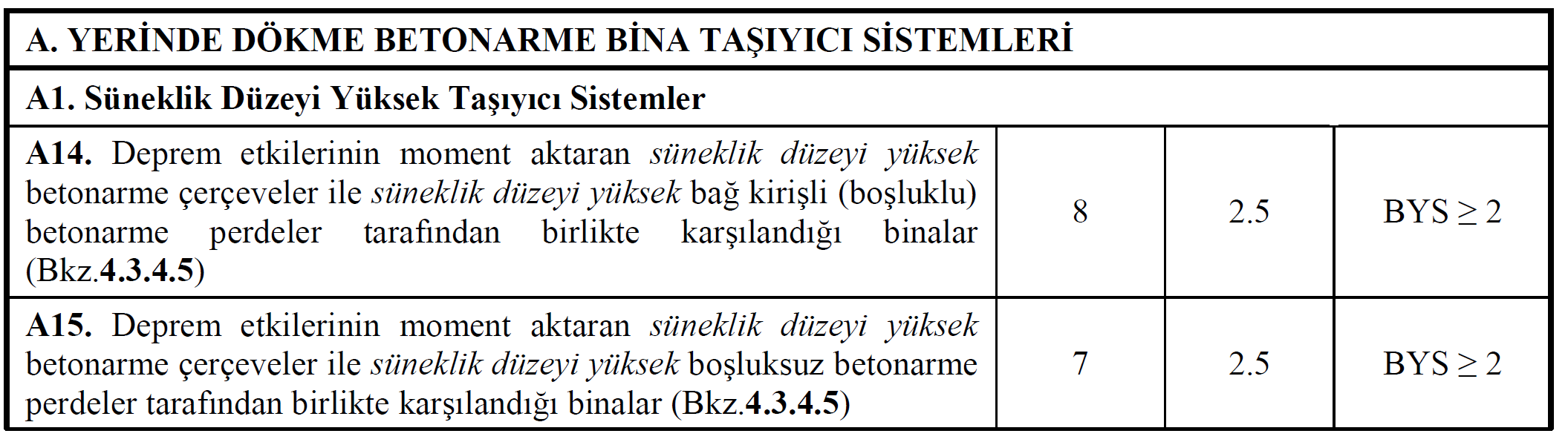 Söz konusu bina normal şartlarda Süneklik düzeyi yüksek bağ kirişli (boşluklu) veya boşluksuz yerinde dökme betonarme perdeler ile moment aktaran süneklik düzeyi yüksek çerçevelerin birlikte kullanıldığından taşıyıcı sistem olarak A14 ve A15 taşıyıcı sistemleri seçilmesi gerekirdi.