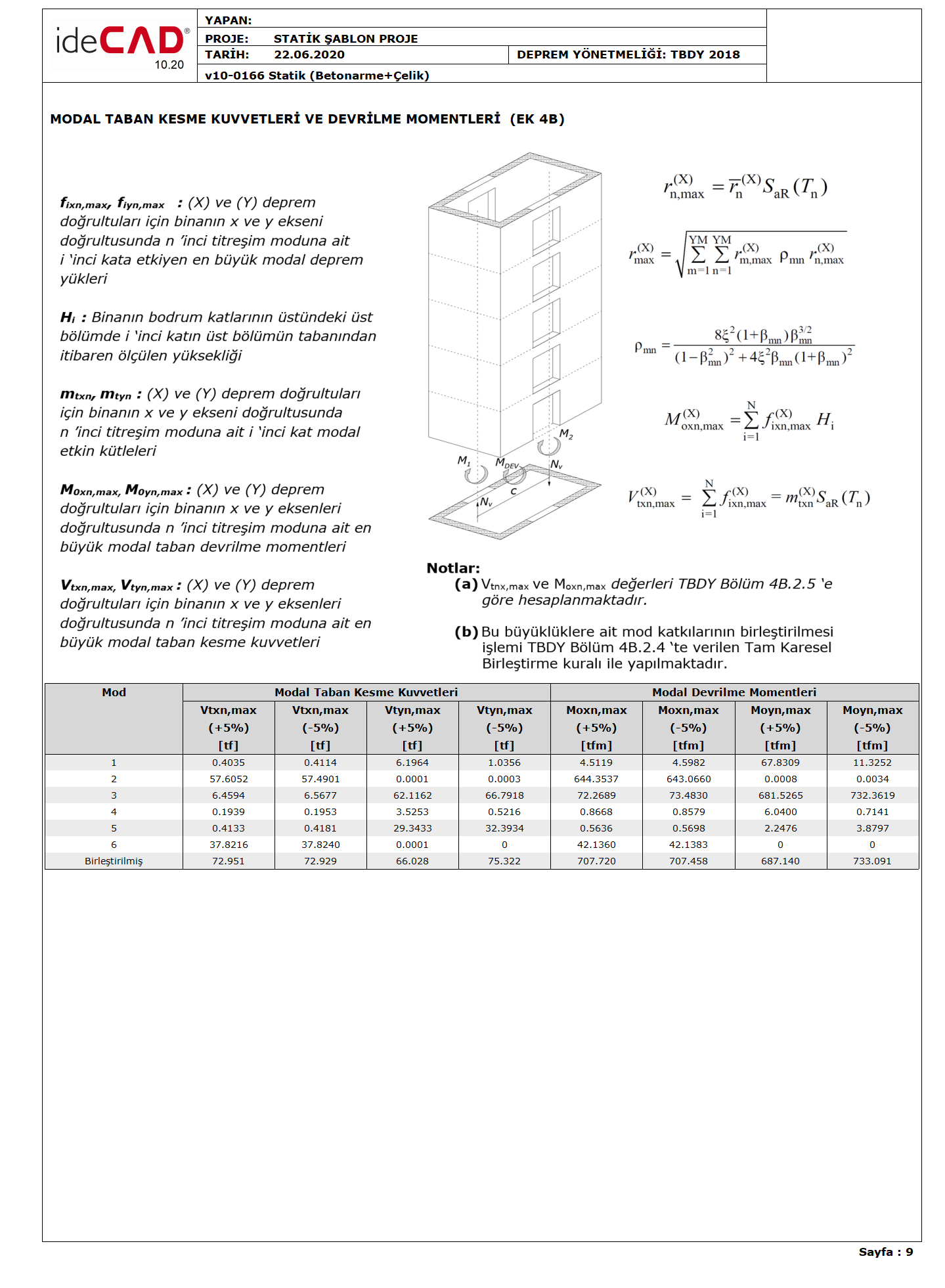 Perdelerin tabanında deprem yüklerinden meydana gelen devrilme momentlerinin toplamı, MDEV , binanın tümü için deprem yüklerinden tabanda meydana gelen toplam devrilme momenti, Mo değerleri TBDY EK 4B.2.5 'de anlatılan mod birleştirme yöntemi kullanılarak hesaplanır. TBDY EK 4B.2.5 'e göre bulunan modal taban kesme kuvvetleri ve buna karşı gelen taban devrilme momenti 'nin hesaplandığı rapor örneği aşağıda verilmiştir.