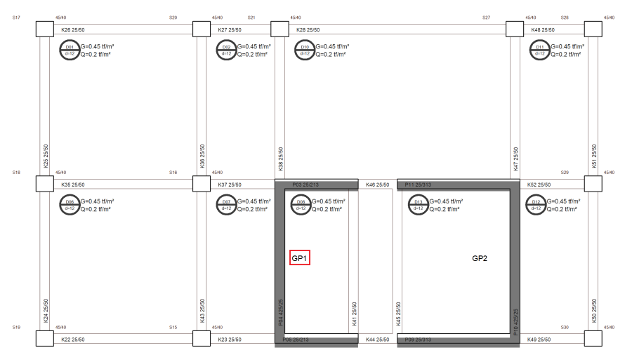 Aşağıda plan görüntüsü verilen ve her bir kat yüksekliği 3m olan 8 katlı yapının GP1 isimli perde grubu için 0.9G'+Ey+0.3Ex-0.3Ez yükleme kombinasyonu altında tasarım eğilme momenti değerleri hesaplanacaktır.