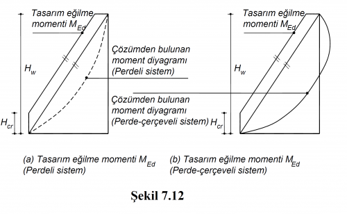 - Hw/lw > 2.0 koşulunu sağlayan perdelerde tasarıma esas eğilme momentleri, kritik perde yüksekliği (Hcr) boyunca sabit bir değer olarak dikkate alınmaktadır. Bu sabit değer perde tabanında Bölüm 4 'e göre hesaplanan eğilme momentine eşit alınmaktadır. Kritik perde yüksekliğinin sona erdiği kesitin üstünde ise, perdenin tabanında ve tepesinde hesaplanan momentleri birleştiren doğruya paralel olan doğrusal moment diyagramı uygulanmaktadır (TBDY Şekil 7.12).