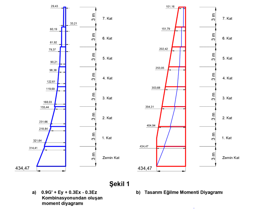 Zemin kat perdesinin alt ucunda Moment değeri 434.47 tfm olarak bulunmuştur. Kritik perde yüksekliği boyunca (Hcr = 4.25m) tasarım eğilme momenti değeri olarak bu değer kullanılacaktır. Kritik Perde yüksekliğinin sona erdiği kesitin üzerindeki bölümde ise zemin kat perdesinin alt ucundaki moment değerinden (434.47 tfm) en üst katın üst ucundaki moment değerine (29.43 tfm) bir çizgi çekilir. Daha sonra Kritik perde yüksekliğinin bittiği bölümden bu çizgiye paralel bir çizgi daha çizilir ve Şekil 1b 'de gösterilen tasarım eğilme moment diyagramı ortaya elde edilir. Perde tasarımı oluşturulan bu moment diyagramı kullanılarak yapılmaktadır.
