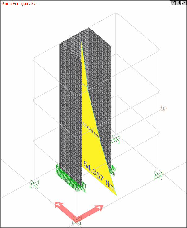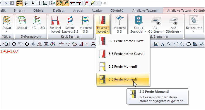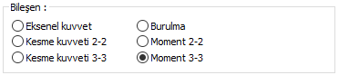 | Bileşen  Perdede oluşan normal kuvvet, kesme kuvveti ve moment değerleri eleman lokal akslarında seçilen herhangi bir kombinasyon için gösterilir. Perde Grubu için deprem yüklemesi Moment 3-3 diyagram örneği  |