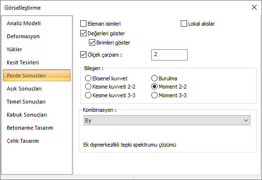 | Ölçek çarpanı  Seçenek işaretli değilse iç kuvvet diyagramları için programın uygun gördüğü ölçek çarpanı uygulanır. İşaretlenirse sağında yer alan kutucuğa istenilen ölçek çarpanı değeri elle girilebilir. |