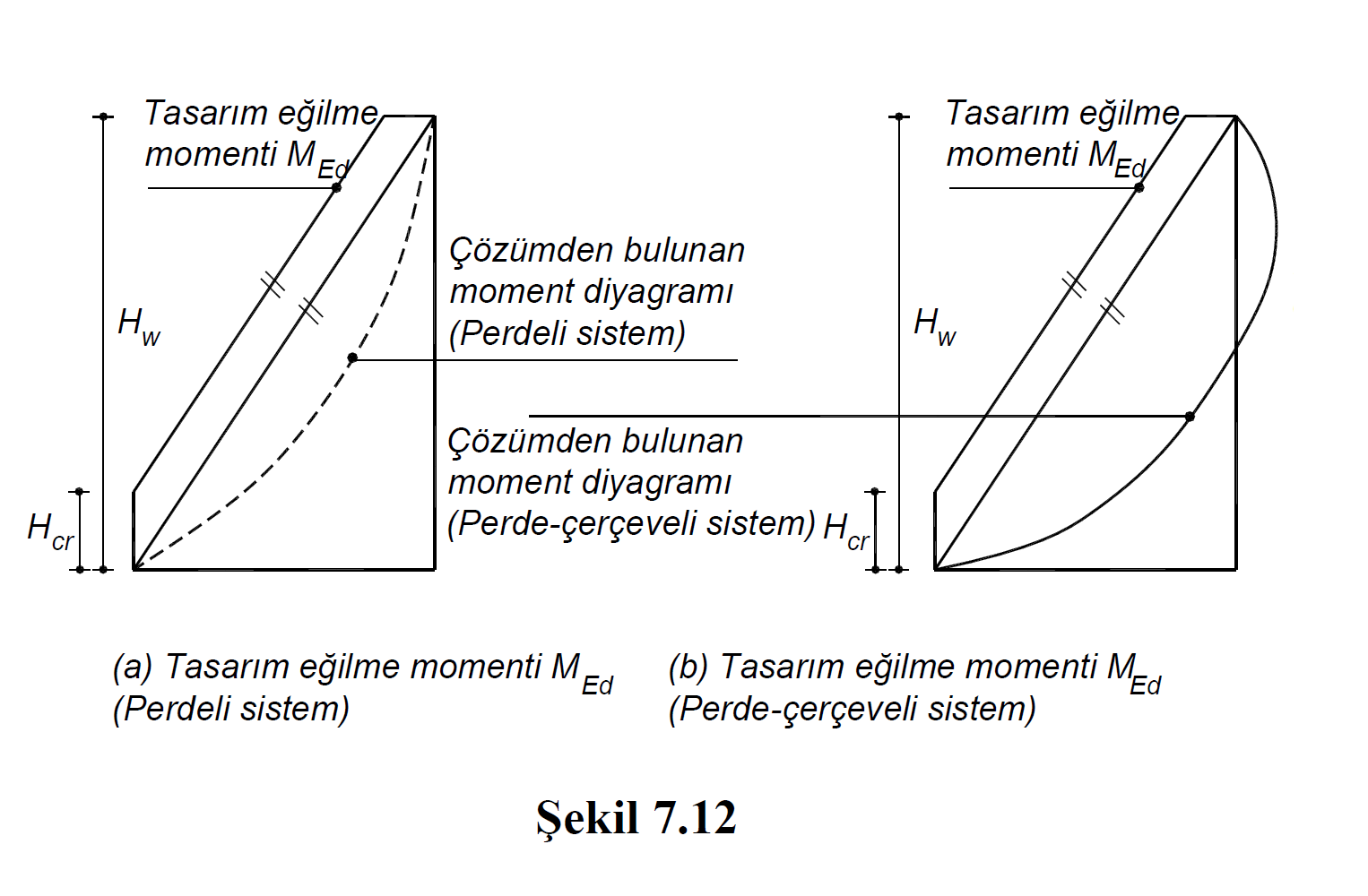 7.6.6.1 – Hw / lw > 2.0 koşulunu sağlayan perdelerde tasarıma esas eğilme momentleri, 7.6.2.2 ’ye göre belirlenen kritik perde yüksekliği boyunca sabit bir değer olarak, perde tabanında Bölüm 4 ’e göre hesaplanan eğilme momentine eşit alınacaktır. Kritik perde yüksekliğinin sona erdiği kesitin üstünde ise, Bölüm 4 ’e göre perdenin tabanında ve tepesinde hesaplanan momentleri birleştiren doğruya paralel olan doğrusal moment diyagramı uygulanacaktır (Şekil 7.12). 3.3.1.1 ’de verilen koşulları sağlayan bodrumlu binalarda sabit perde momenti, 7.6.2.2 ’de tanımlanan kritik perde yüksekliği boyunca gözönüne alınacaktır.