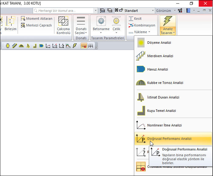 Ribbon menü Analiz ve Tasarım sekmesi Analiz başlığı altından Doğrusal Performans Analizi komutuna ulaşabilirsiniz.