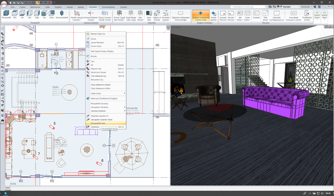 Plan penceresinde seçilen bir objeyi perspektif pencerede hızlıca bulmak için sağ tuş menüde yer alan "Perspektifte Bul" komutu kullanılır.