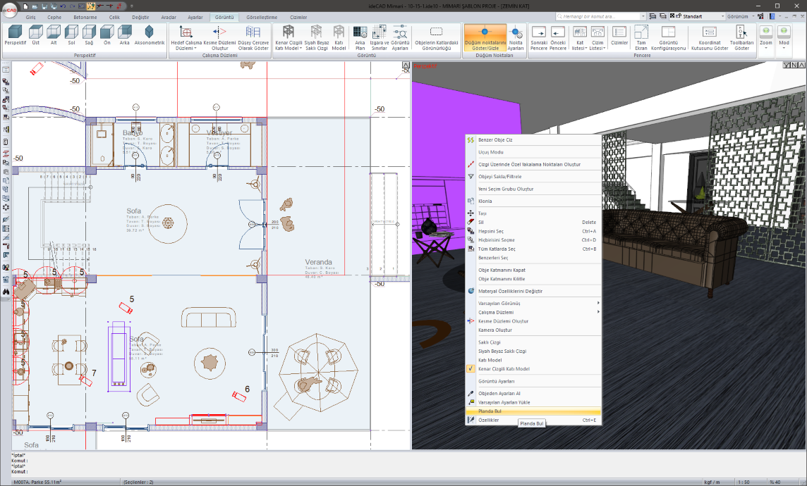 Perspektif pencerede seçilen bir objeyi plan penceresinde bulmak için ise sağ tuş menüden "Planda Bul" komutu kullanılır.
