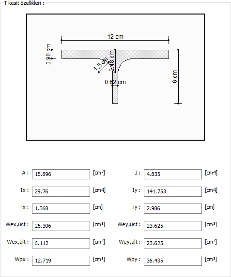 T kesit özellikleri ![]() A: Kesit alanını gösterir. |