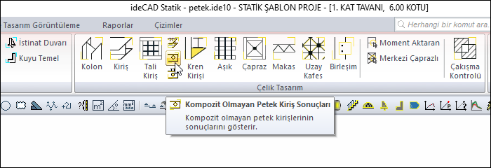 Analiz yapıldıktan sonra, ribbon menü Analiz ve Tasarım sekmesi Çelik Tasarım başlığı altından Kompozit Olmayan Petek Kiriş Sonuçları komutuna tıklayarak ulaşabilirsiniz.
