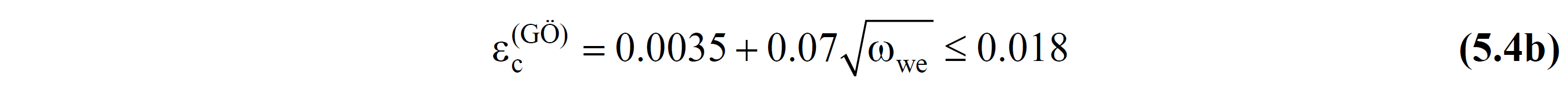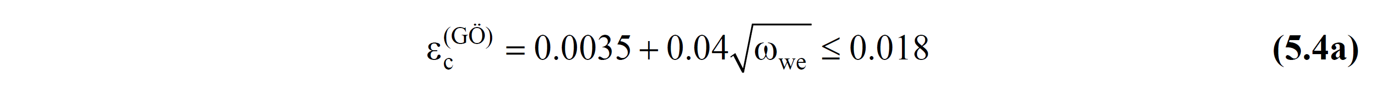 TBDY 5.8.1.1 'e göre Göçmenin Önlenmesi (GÖ) Performans Düzeyi için yapılacak performans değerlendirmesinde yayılı plastik davranış modeli 'ne göre hesaplanan beton malzemesinin birim şekildeğiştirme sınır değerleri εc(GÖ) Denk.(5.4) 'te verilmiştir. Dikdörtgen kesitli kolon, kiriş ve perde elemanlarında Denk.(5.4a) , dairesel kesitlerde Denk.(5.4b) kullanılmaktadır. εc(GÖ) hesabında ωwe etkin sargı donatısının mekanik donatı oranı ’nı göstermektedir. Şekildeğiştirme ve İç Kuvvet Sınırları (Yeni Bina))