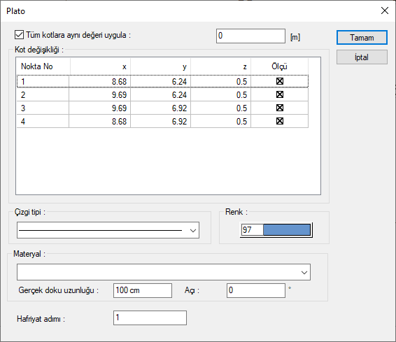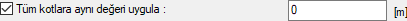 Tüm kotlara aynı değeri uygula ![]() Özellik aktif hale getirilerek buraya girilen değerin bütün kot noktalarına uygulanması sağlanır. |