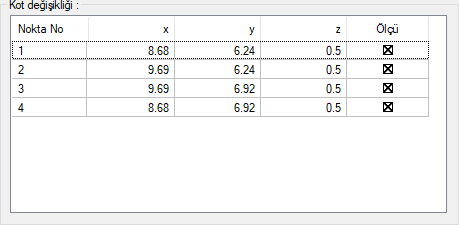 Kot değişikliği ![]() Yerleştirilen kot noktalarının koordinatları verilir. İstenirse z kutusuna yeni bir değer girilebilir. |