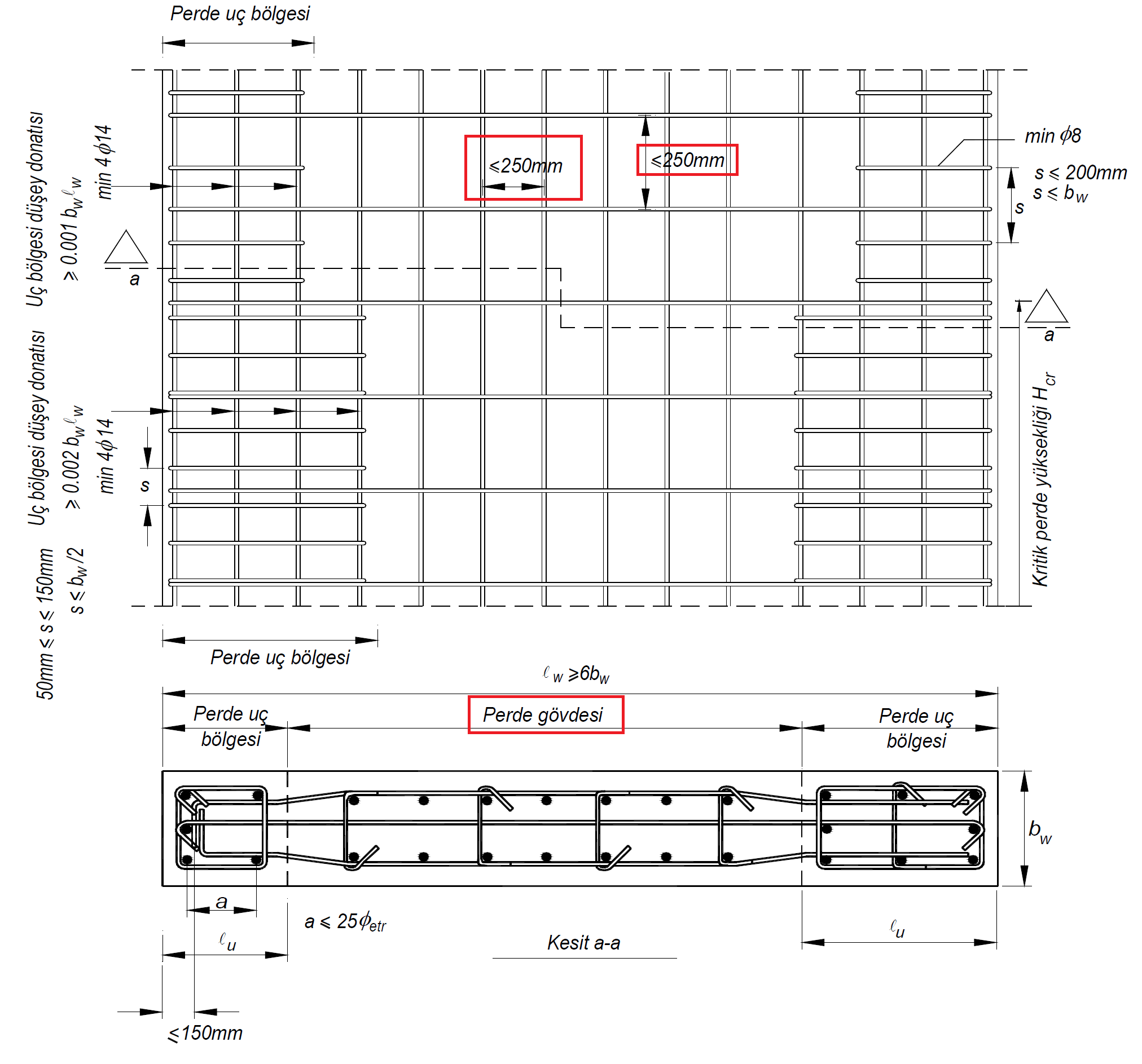 TBDY Şekil 7.11 'de perde gövdesi ve minimum donatı aralığı koşulları belirtilmiştir.