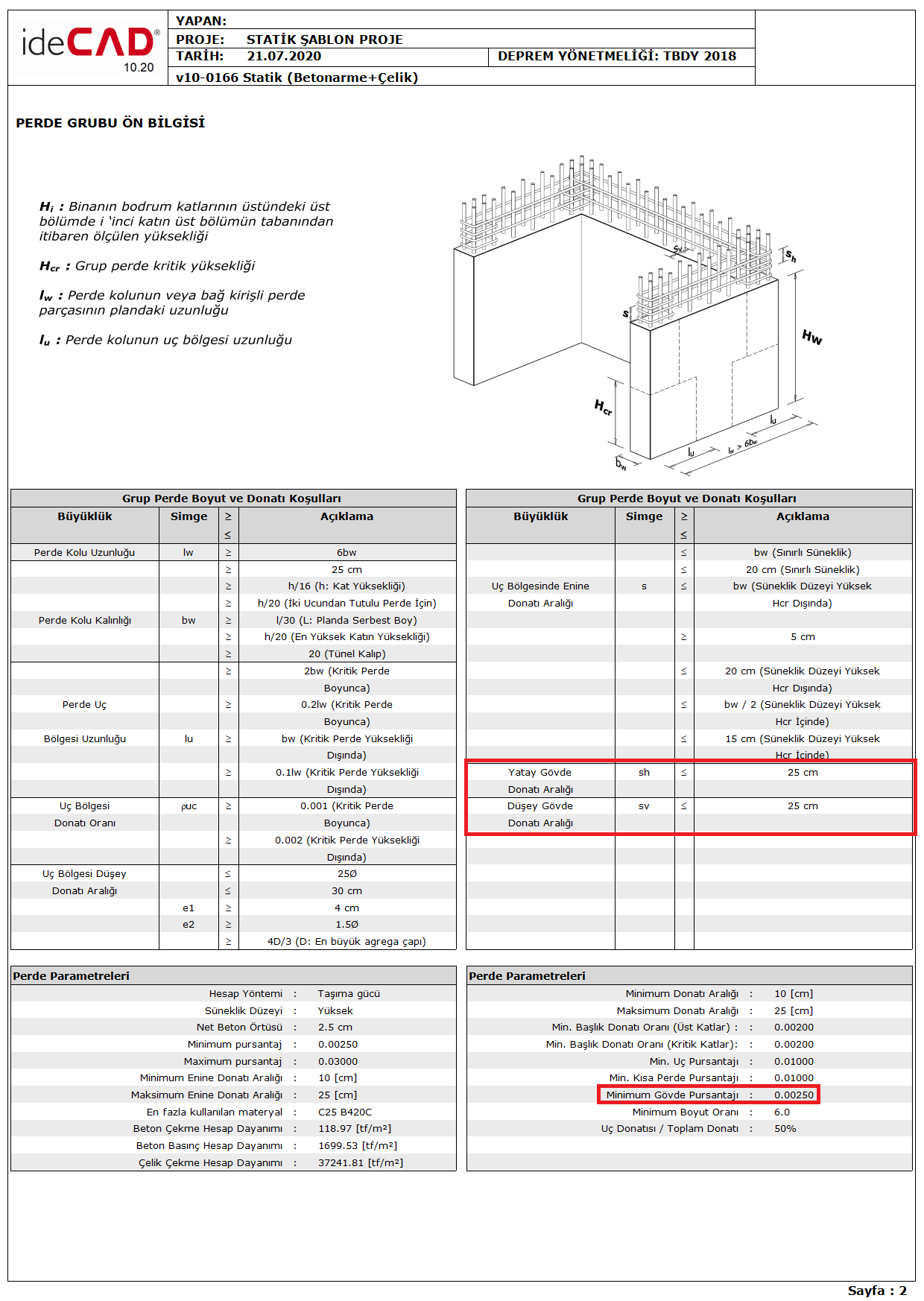 TBDY Madde 7.6.3.1 'e göre poligon perde kollarının her iki yüzündeki donatıların toplam enkesit alanı, boyuna ve enine donatıların her biri için, poligon perde kolu gövdesi brüt enkesit alanının 0.0025 'inden az olmamalıdır. Eğer Hw/lw≤ 2.0 ise perde gövdesi, perdenin tüm kesiti olarak gözönüne alınır. Bununla birlikte perde gövdesinde boyuna ve enine donatı aralığı 250 mm 'den fazla olmamalıdır. Bu koşulların Poligon Perde Ön Bilgileri raporunda belirtilmiştir. Aşağıdaki resimde örnek bir Poligon Perde Ön Bilgileri raporu gösterilmiştir. Yukarıda anlatılan koşullar kırmızı ile işaretlenmiştir.