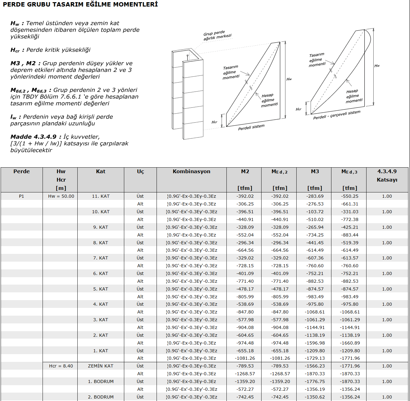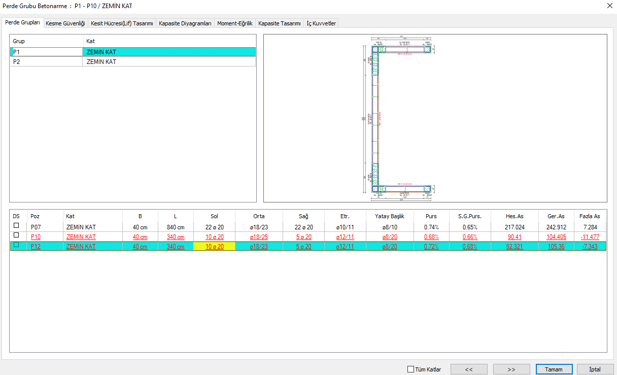 Grup perde sonuçları betonarme tasarım ve raporlarda ayrıca verilmektedir. Grup perde iç kuvvetlerinin belirlenmesi ve tasarım özel kuralları için Poligon Perdelerin Tasarımı'nı inceleyebilirsiniz.