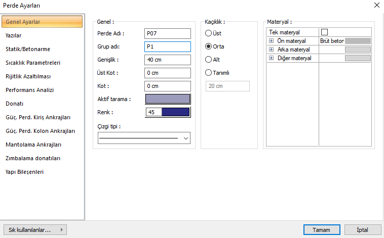 Enkesit şekli I, T, L, U veya C olan betonarme perdelerde, TBDY Madde 4.5.3.5 ile birlikte perdeleri grup olarak modelleme zorunluluğu gelmiştir. Grup perdelerde sonlu eleman düğüm noktası kuvvetlerinin bileşkeleri, betonarme kesit hesabında esas alınmak üzere enkesit ağırlık merkezinde eşdeğer çubuk kesit tesirleri (eğilme/burulma momentleri, kesme kuvvetleri, eksenel kuvvet) otomatik olarak elde edilmektedir. Enkesit şekli I, T, L, U veya C olan betonarme perdelerde gruplama işlemi için perde menüsü genel ayarlar bölümünde yer alan grup adı kutucuğundan faydalanılmalıdır.