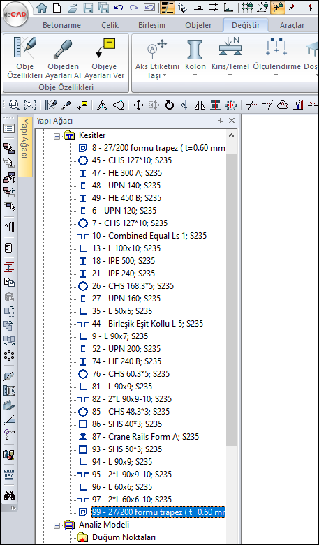 Tanımladığınız kesit, Yapı Ağacı görünümünde Kesitler satırı altında listelenecektir.