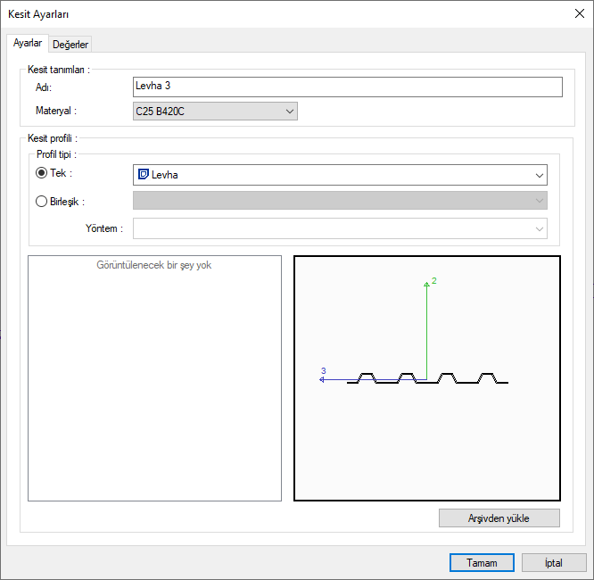 Kesit Ayarları diyalogu açılacaktır. Kesit adınızı ve materyalinizi ayarlayın.