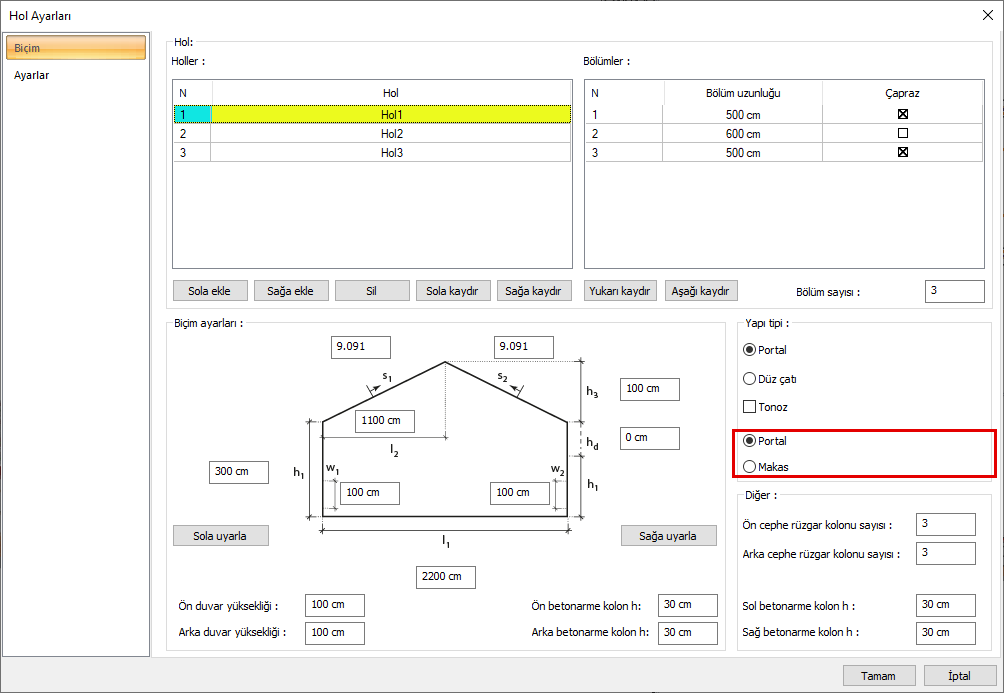 Portal ve makas ayarı ile hol ayarları diyaloğunda seçilen hole, portal olarak tanımlanan kirişli sistem ya da makas olarak tanımlanan örgü sistem tanımlanır.