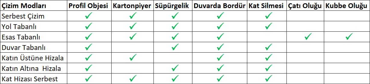 Profil objelerine göre kullanılabilen çizim modları değişmektedir. Aşağıdaki tabloda hangi çizim modlarının hangi objeler için kullanılabildiği verilmiştir.