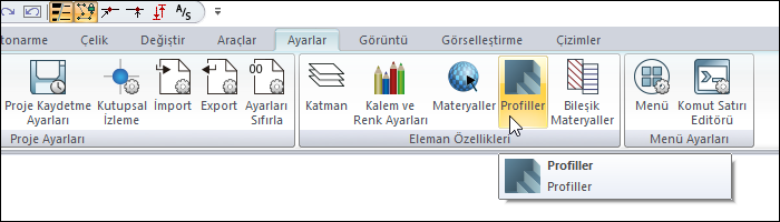Profiller komutu ile daha önce tanımlanmış enine kesit listelerine ulaşılır.