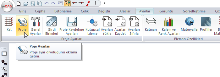 Ribbon menü Ayarlar sekmesi Proje Ayarları başlığı altından ulaşabilirsiniz.