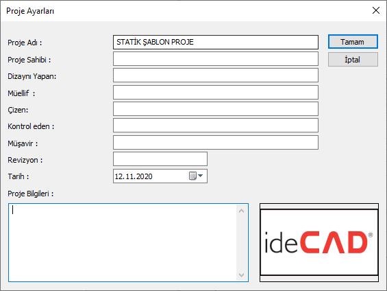 Proje adı, proje sahibi, revizyon ve tarih gibi bilgiler proje dosyasına girilir. Ayrıca firma logo kutusu tıklanarak logo proje içerisine alınır.