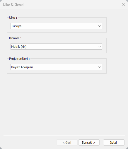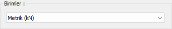 Birimler ![]() Seçilen ülkeye göre bririm otomatik olarak seçili gelir. İstenirse listeden imperial, metrik (kN) ve metrik (tf) seçeneklerinden biri seçilerek değiştirilir. |