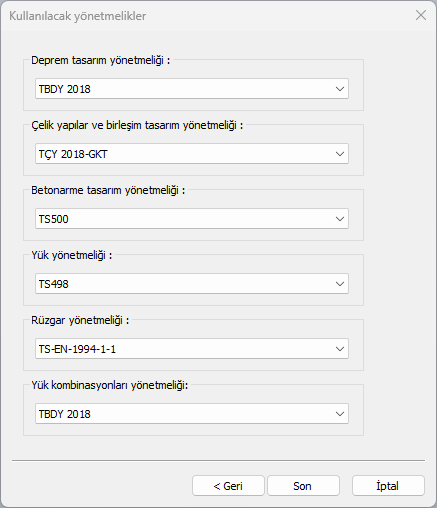 Yük kombinasyonları yönetmeliği ![]() Seçilen ülkeye göre yönetmelik seçili gelir. Uluslarası için IBC; ABD için ASCE7-16, UBC 97, IBC; Türkiye için TBDY 2018; Endonezya için ASCE7-16, UBC 97, IBC; Dominik Cumhuriyeti için ASCE7-16, UBC 97, IBC; Tayland için ASCE7-16, UBC 97, IBC; Filipinler için ASCE7-16, UBC 97, IBC; Pakistan için ASCE7-16, UBC 97, IBC yük kombinasyonları yönetmelikleri listelenmektedir. |