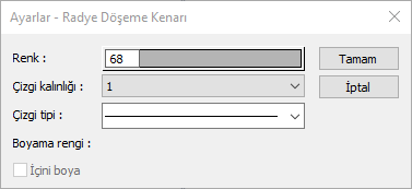 Çizgi Kalınlığı ![]() Radye döşeme kenarının kalınlığı ayarlanır. Burada verilen kalınlık sadece ekranda görünür. Proje çizdirildiğinde, dikkate alınmaz. Çizicide dikkate alınacak kalem kalınlığını kalem kalınlıkları bölümünden veya renk kutucuğunu shift tuşu ile birlikte tıklayarak yapabilirsiniz. |