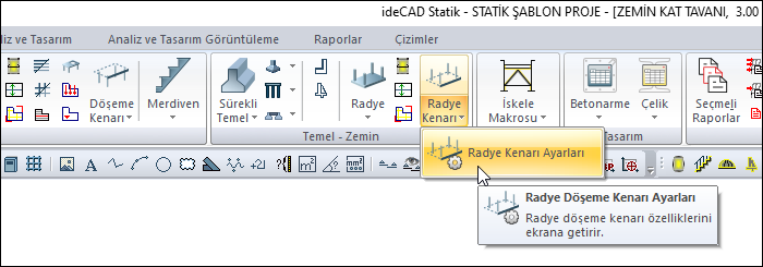 Radye Kenarı Ayarları komutuyla radye döşeme kenarı ayarlarına ulaşılır. Ayarlar-radye döşeme kenarı diyaloğunda kullanıcı tarafından değiştirilebilir parametreler mevcuttur.
