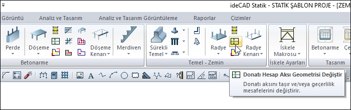 Donatı Hesap Aksı Geometrisi Değiştir komutu ile radye temel hesap akslarının konumu ve çalışma mesafeleri yeniden düzenlenir.