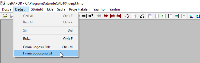 ideCAD Rapor’da Değiştir menüsü altında bulunan Firma Logosunu Sil satırını tıklayın.