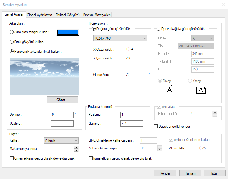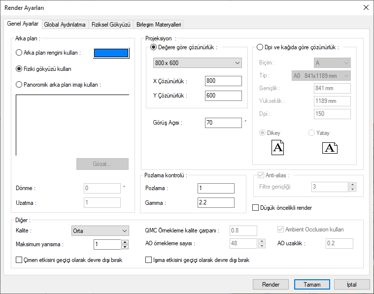 Render ayarları diyaloğu açılacaktır.