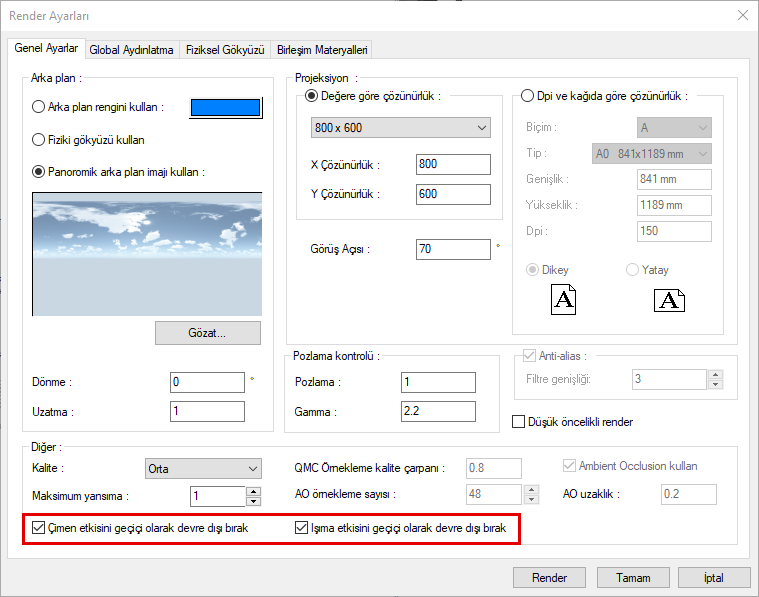 Çimen etkisini geçici olarak devre dışı bırak ve Işıma etkisini geçici olarak devre dışı bırak özellikleri sadece alınan render için render ayarları diyaloğundan kapatılır. Renderı alma süresi kısalır.