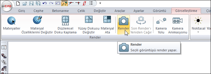 Ribbon menü Görselleştirme sekmesi Render başlığı altından ulaşabilirsiniz.