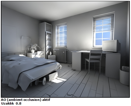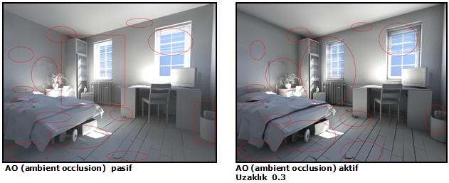 Ambient occlusion kullan ![]() Ambient occlusion kullanımı, obje içindeki ve objeler arası detayları daha belirgin hale getirmeye yarar. AO örnekleme sayısı arttıkça detay kalitesi artar. AO uzaklık değeri ise ambient occlusion uygulanacak yüzeydeki etkinlik uzunluğunu gösterir. ![]() ![]() |