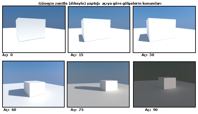 Güneşin zenitle (dikeyle) yaptığı açı ![]() Güneşin Z ekseniyle yaptığı açıdır. Güneşin dikeydeki konumu 0° ile 90° arasında verilebilir. Açı 0 (sıfır) iken güneş tam tepededir. Diğer bir deyişle öğlen güneşidir. Bu açıda gölge oluşmaz. 30-40° gibi değerler yaklaşık olarak saat 15.00-16:00 gibi ikindi güneşi değerlerine tekabül eder. 88-89-90° gibi açılar ise güneşin battığı açı değerleridir. Gece render'ı almak istendiğinde kullanılır. ![]() Açı değeri büyüdükçe yani akşam güneşine yaklaştıkça gölge boyları uzayacaktır. ![]() |