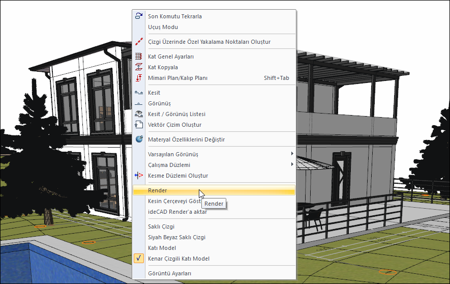 Perspektif penceresinde farenin sağ tuşuna tıklayarak açılan menüden Render komutuna ulaşabilirsiniz.