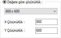 Değerlere göre çözünürlük – X/Y Çözünürlük ![]() Görüntülenecek resmin piksel cinsinden x ve y boyutları girilir. Çözünürlük arttıkça render boyutu artarken render süresi de uzayacaktır. |