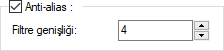 Anti-alias ![]() Render alınan objelerin kenarlarında çıkan kırıklıkları (testere dişi görünümünü) düzeltmek için kullanılır. Tercih edilen render kalitesine göre otomatik atanan değerler uygulanır. Düzeltme işleminin hassasiyeti arttırılmak istenirse, render kalitesi tanımlı hale getirilir. Aktif hale gelen filtre genişliğine daha büyük bir değer girilir. |