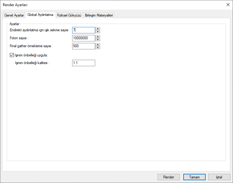 Endirekt aydınlatma için sekme sayısı ![]() Fotonların çarptığı yüzeylerden kaç kere yansıyacağı sayısal olarak girilir. |